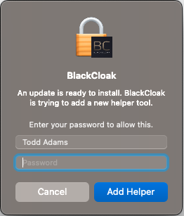 This is expected and you should enter your password for your computer to add the BlackCloak helper.
