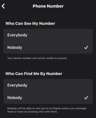 Tap Phone Number at the top of the screen. Here, you can adjust who can see and find you on the Signal app via your phone number