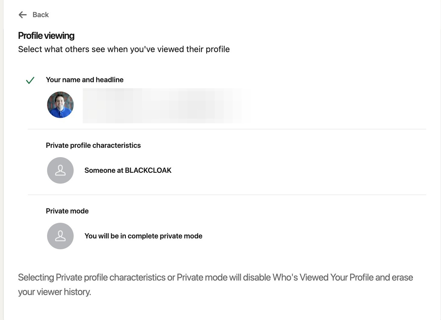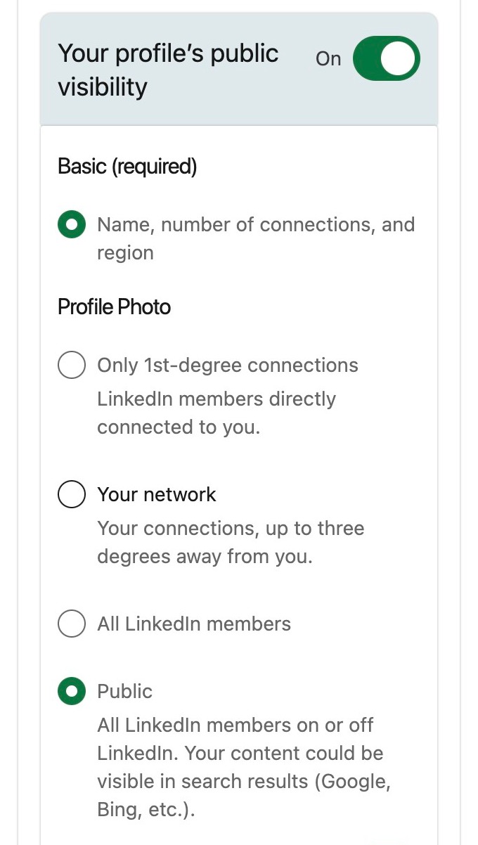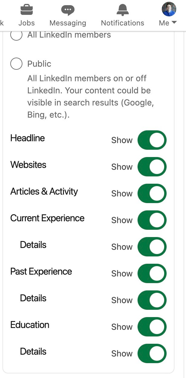 Here, you can adjust what people can see when they view your profile. It can either be your name and title, only the place where you work, or you will be in complete private mode