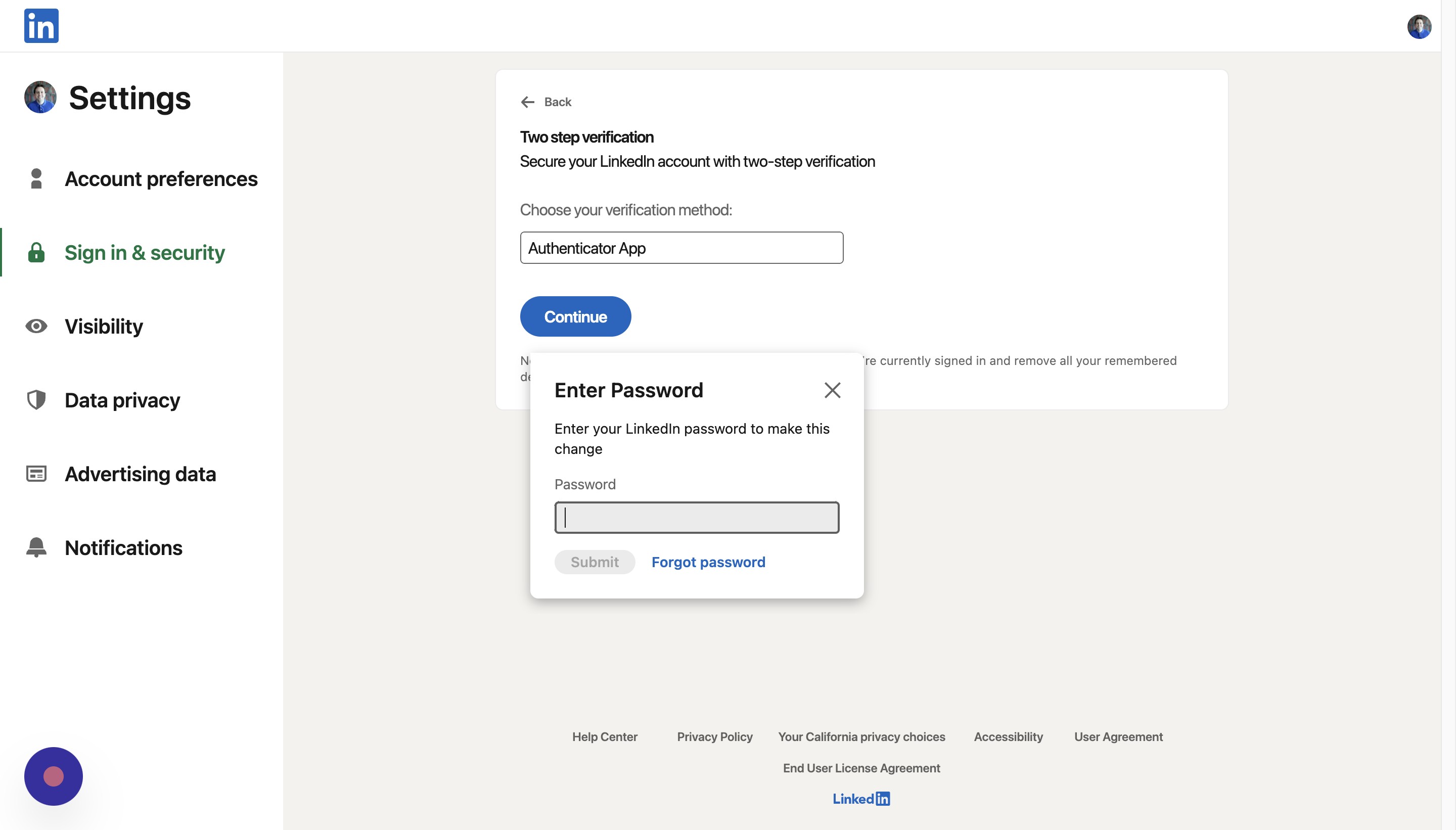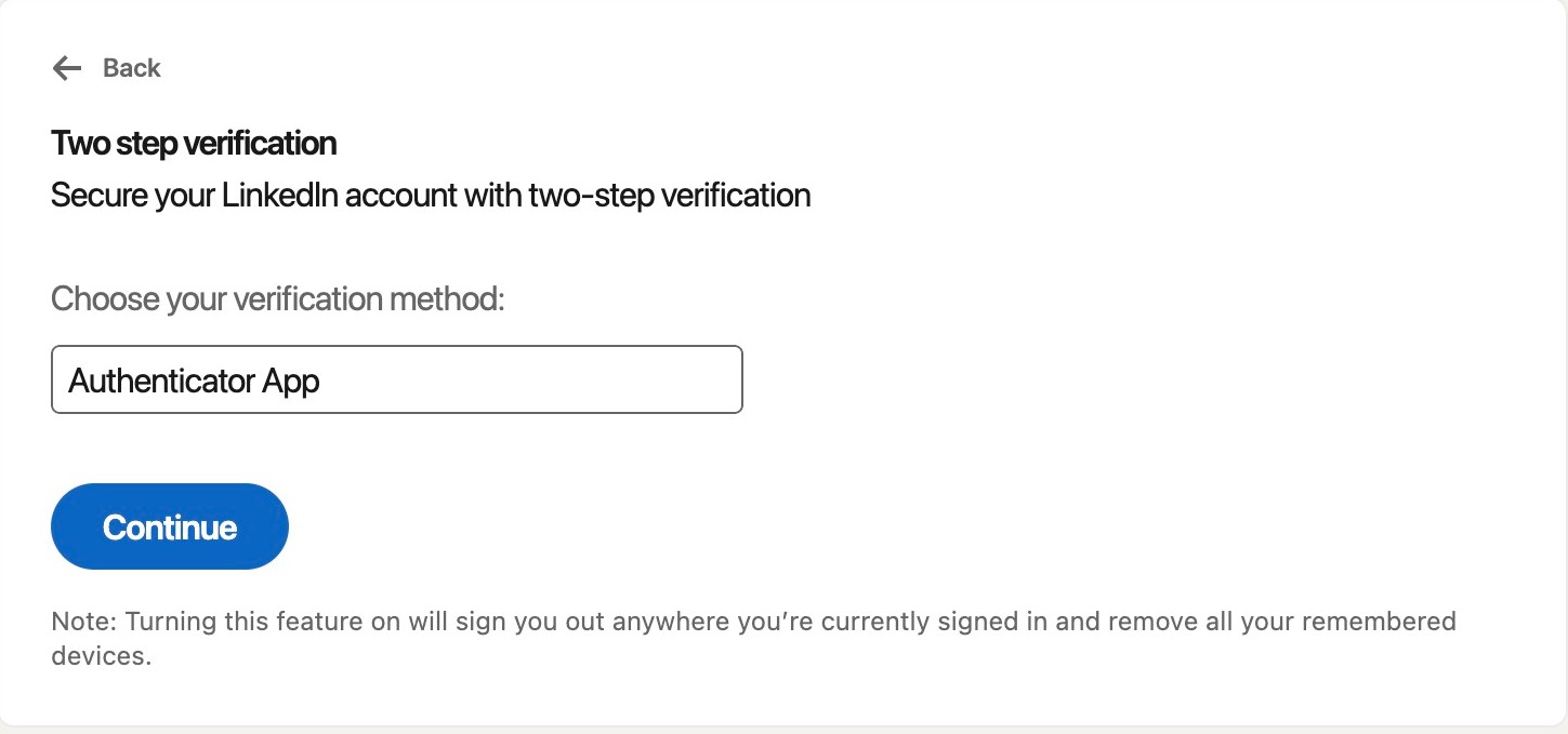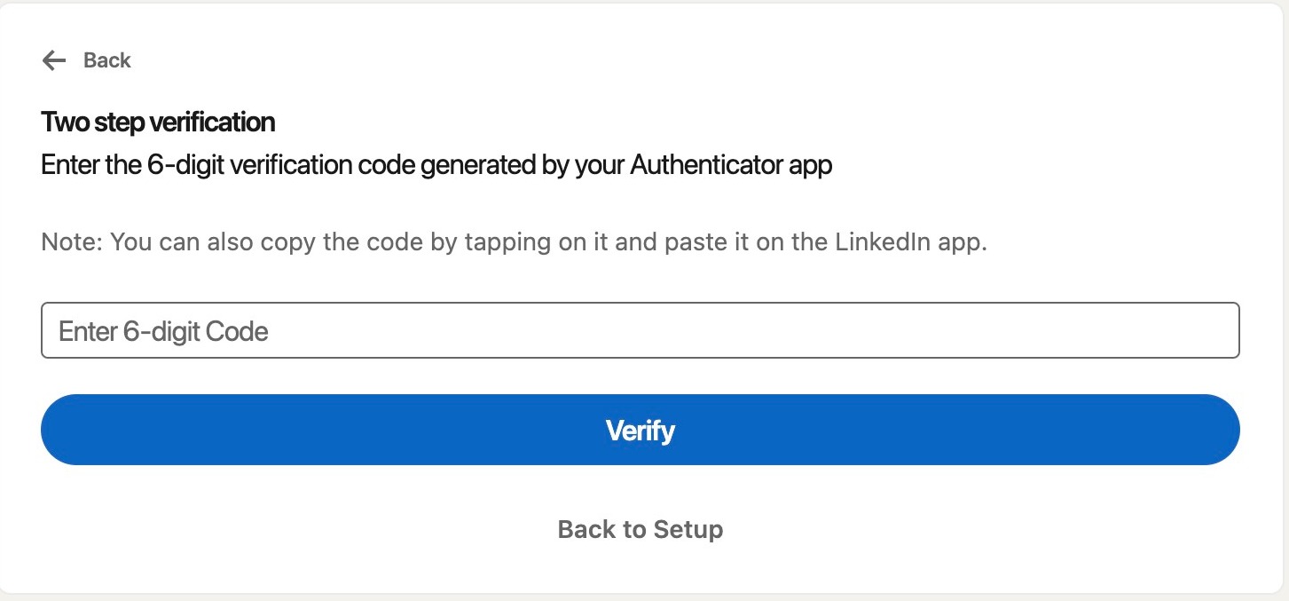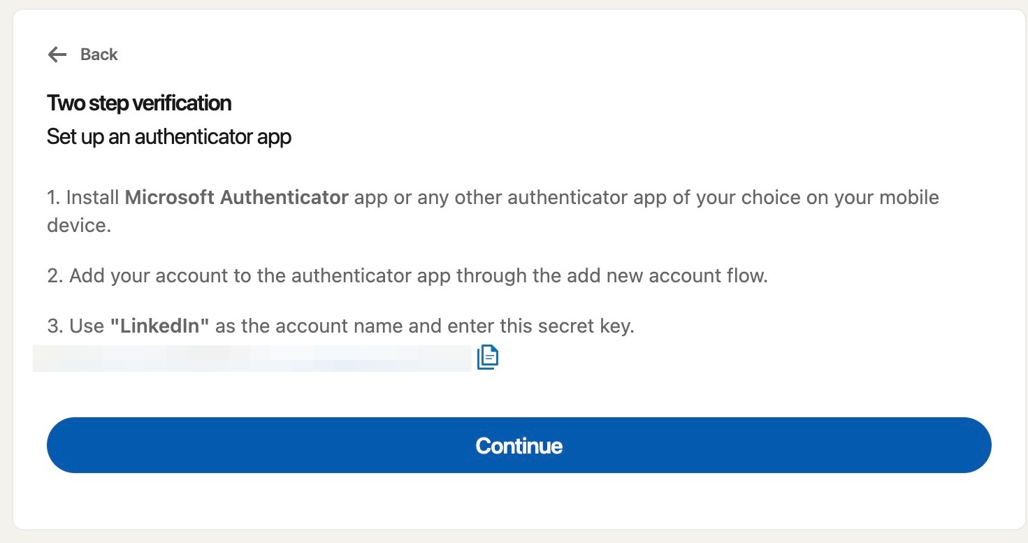 Open your authenticator app and enter in the key provided by LinkedIn. Then hit continue