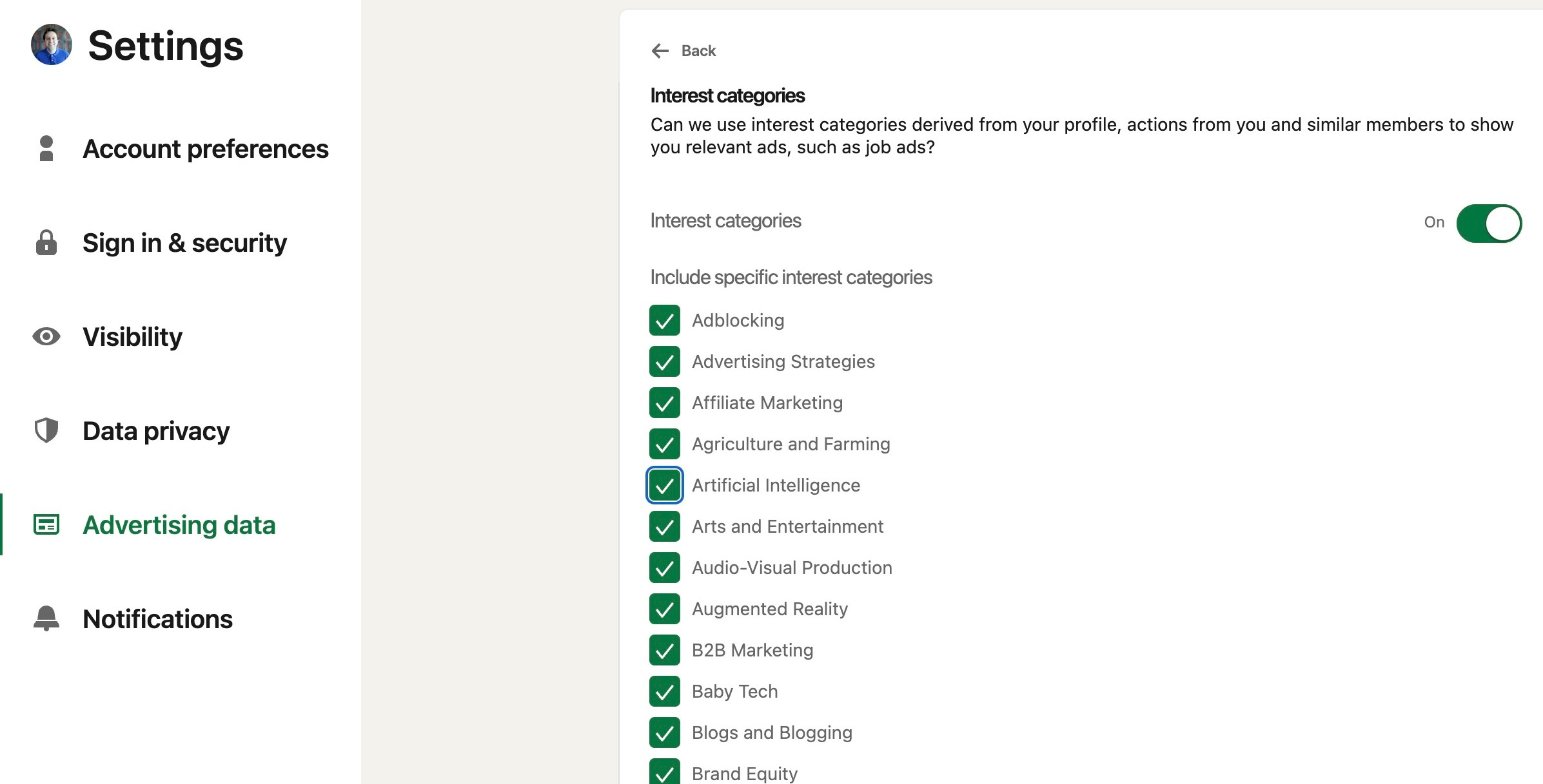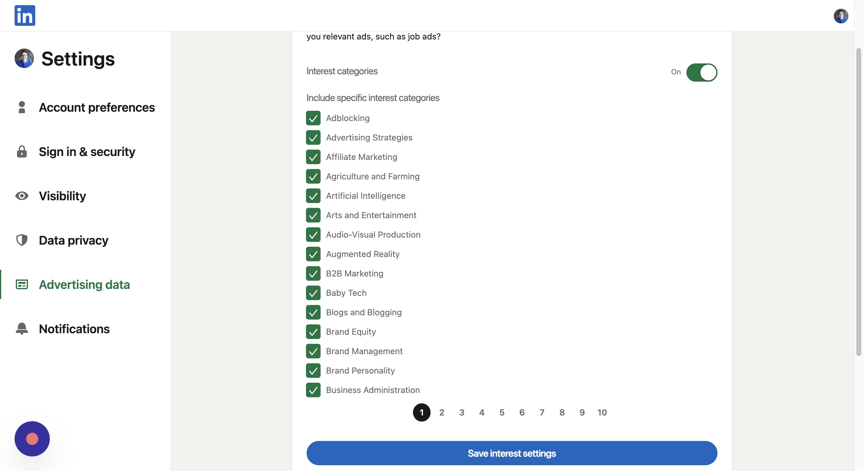Back on the advertising data page, click interest categories