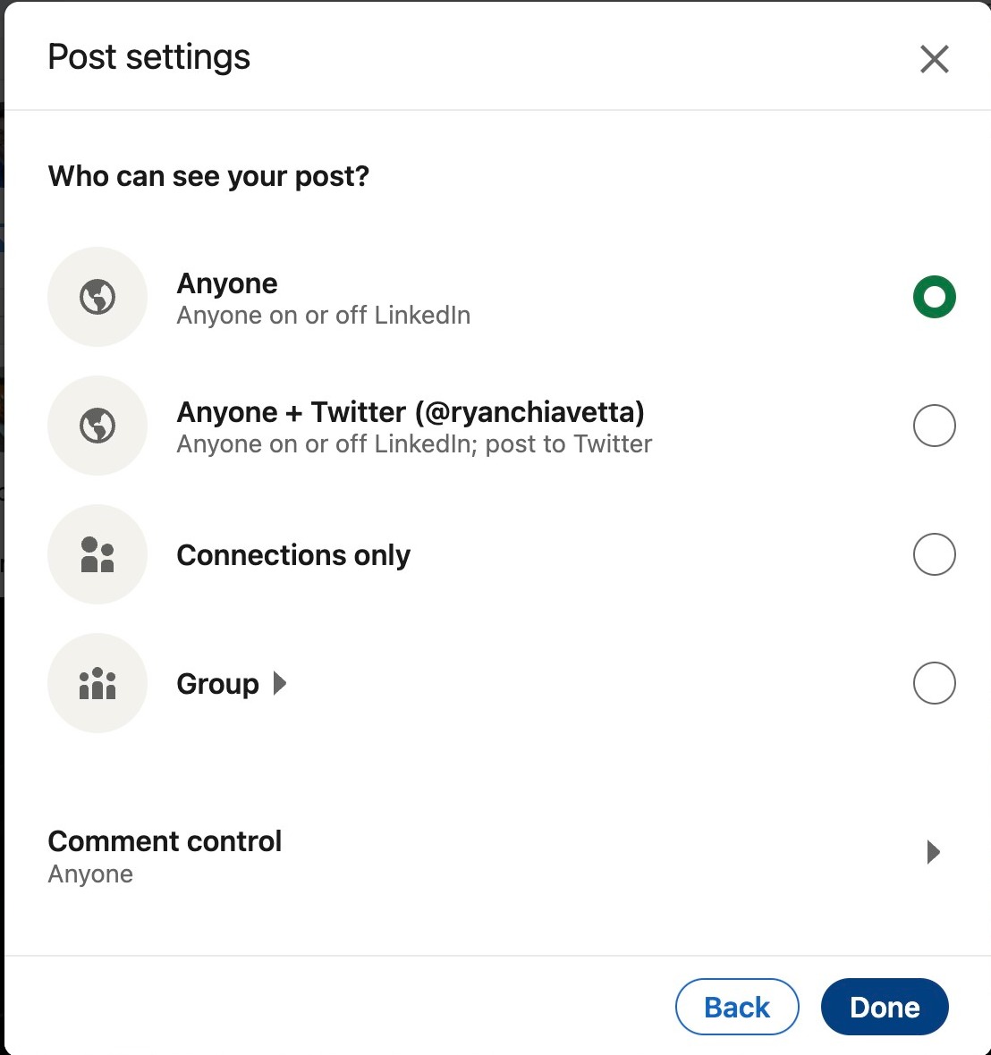 Here you can choose whether your post can be seen by anyone on LinkedIn or only by your connections. You can also choose to send your post to any linked social media platforms, or certain groups you have joined. After you made your decision, click done