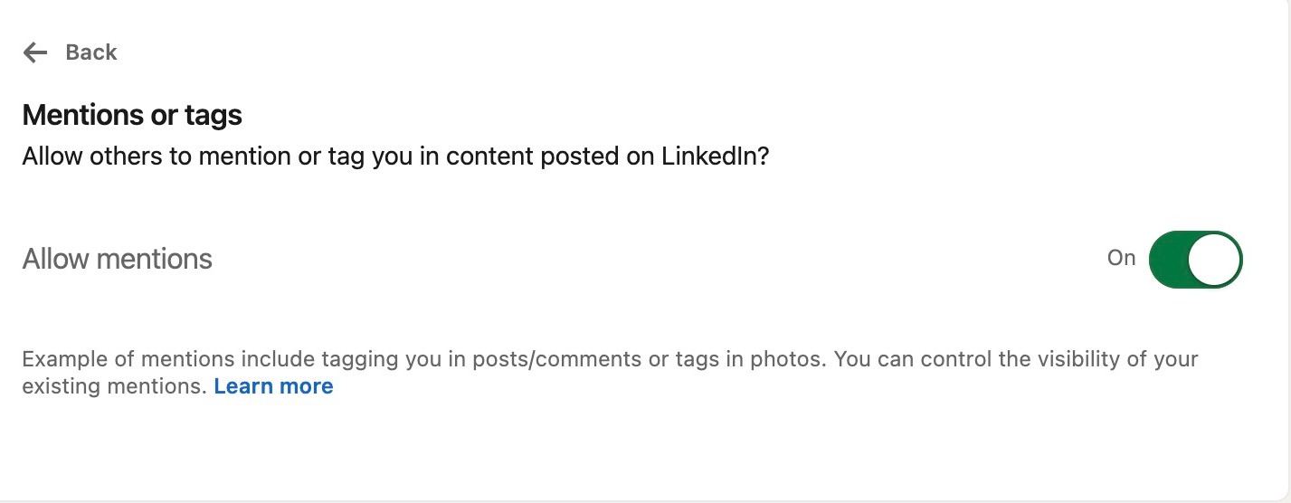 Click this button if you want to allow other LinkedIn users to tag you in content posted to the platform