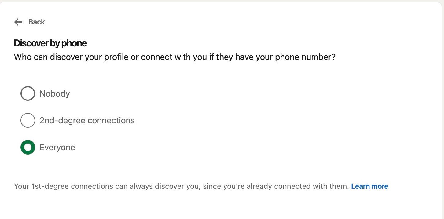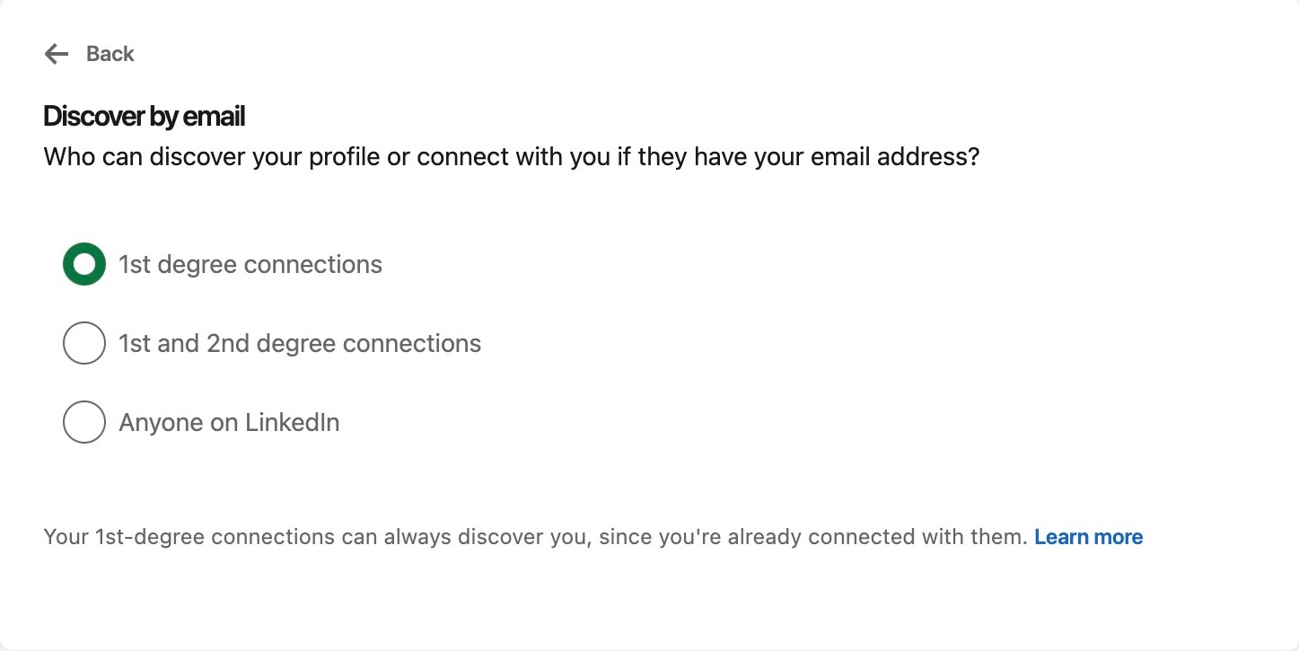 Here, you can choose who can discover your profile or connect with you if they have your email address