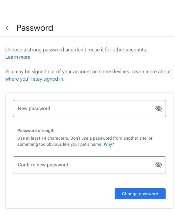 Enter and re-enter your new password. Once you've made a strong, unique password, click change password