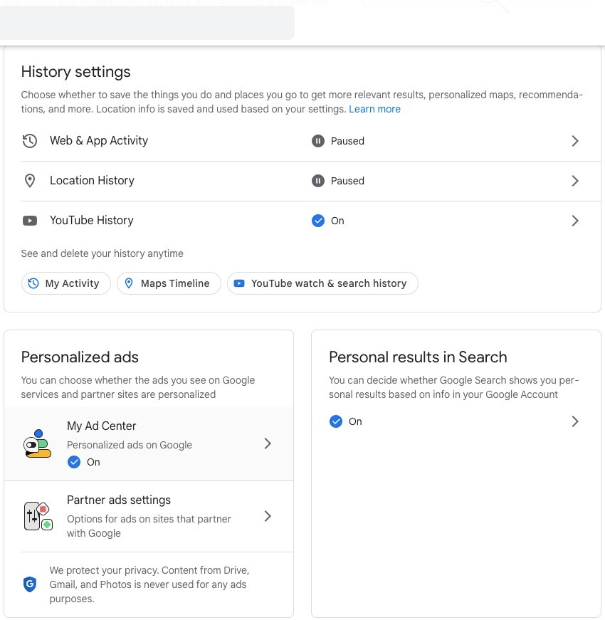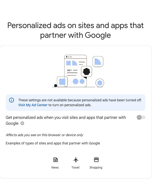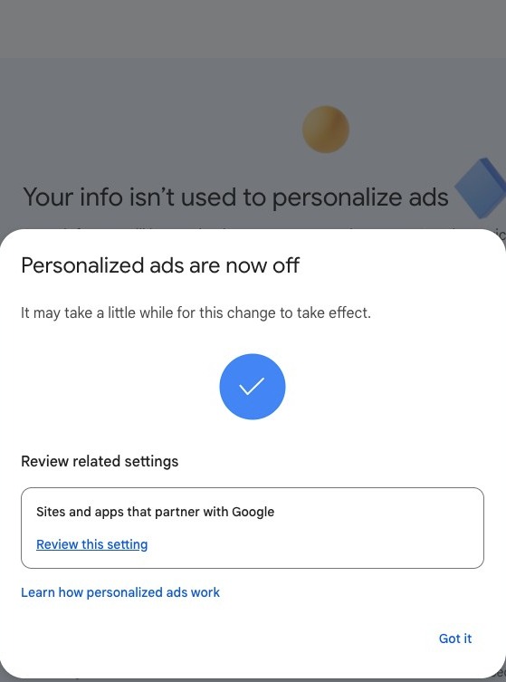 After you turned off personalized ads, you can review your settings for sits and apps that partner with Google. Click here