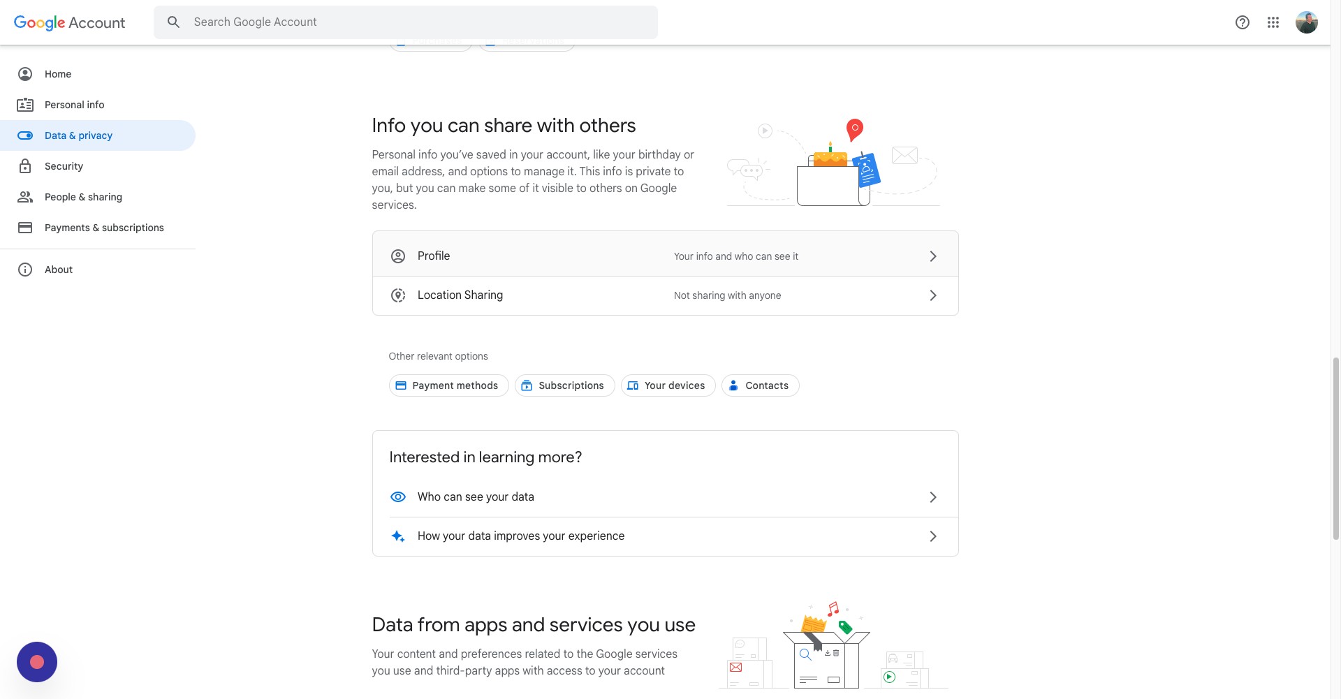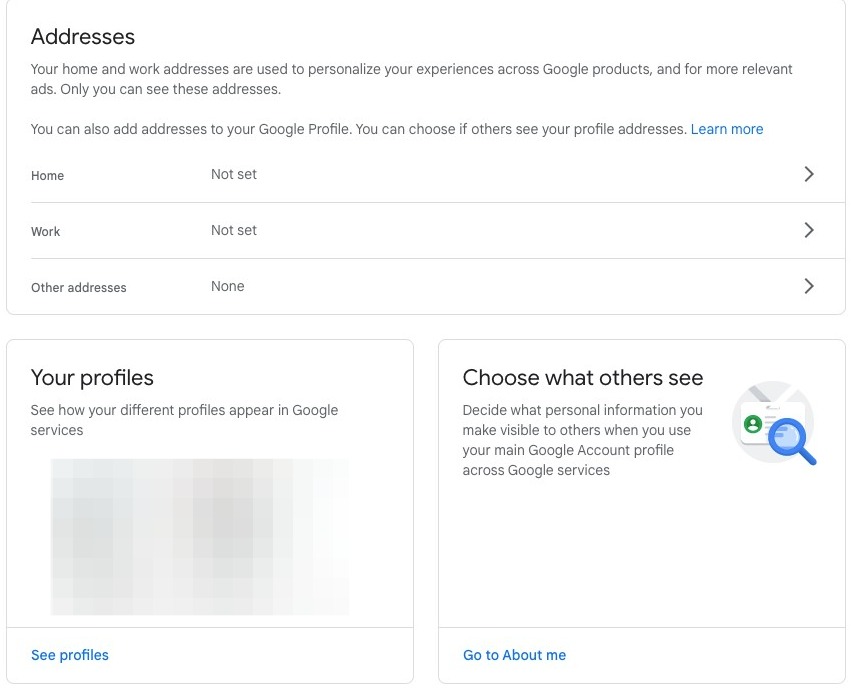 You will also be able to see any addresses you have shared with Google, as well as your other Google profiles