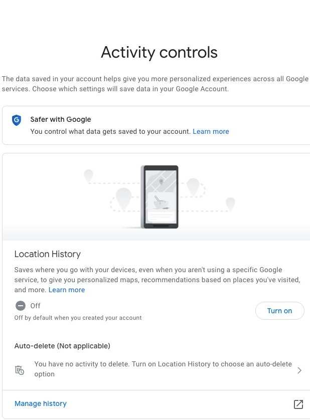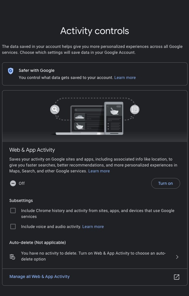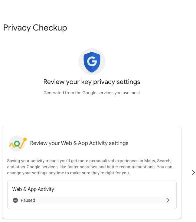 First, you'll be asked to review your web & app activity settings. Click here