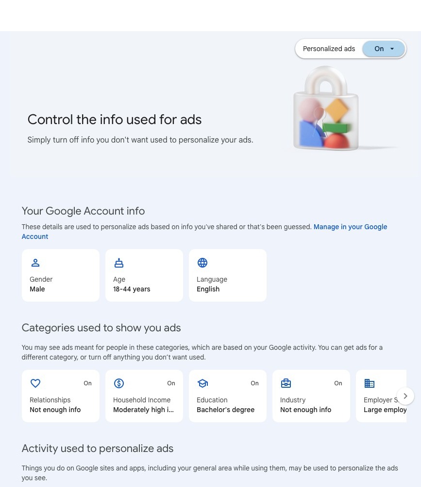 Here, you can see what information Google uses for ads. To adjust your settings for personalized ads, click here