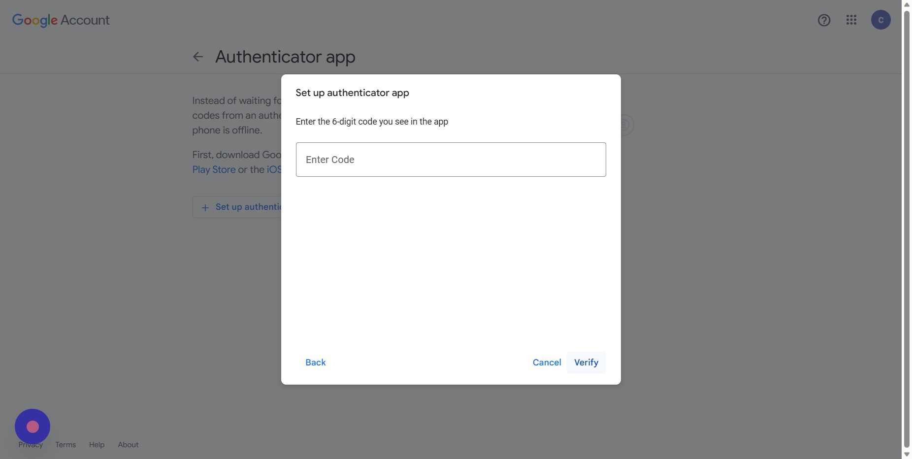 Enter the six digit code produced by the authenticator app and click verify to complete the process