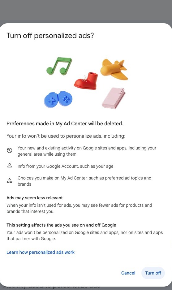 Click turn off if you do not wish to receive personalized ads