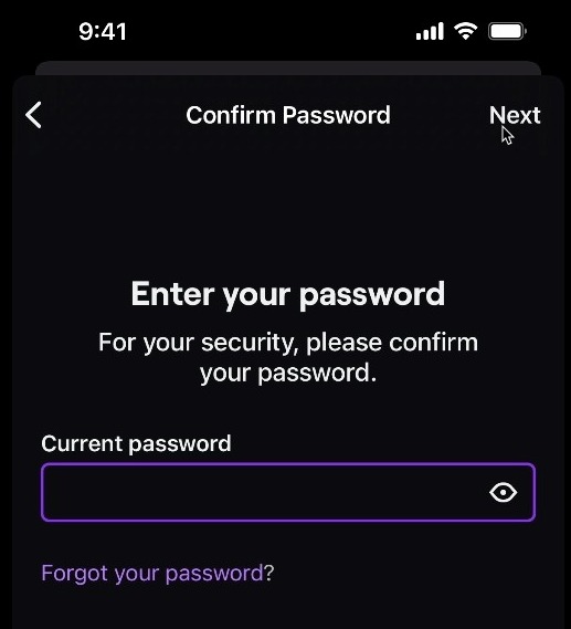 Enter your current password and click Next to complete the process