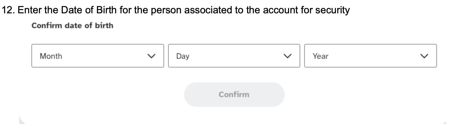 For security purposes, enter the date of birth for the person associated with the account, then click Confirm