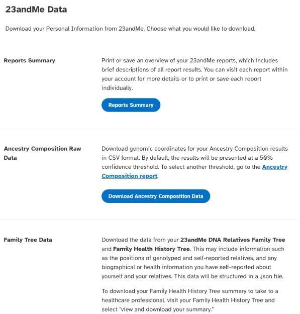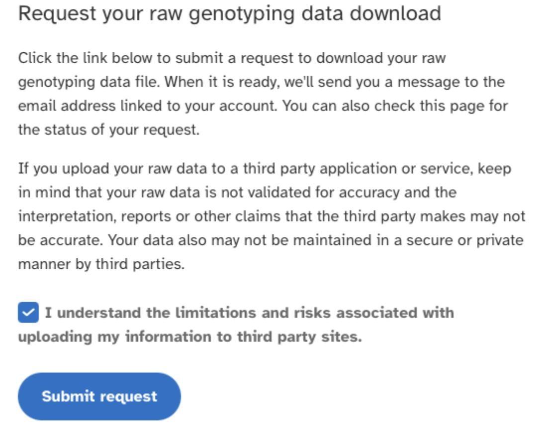 NOTE: If you decide to download your raw genotyping data, it may take a few days for this request to be completed. By downloading your raw genotyping data, you will have full access to your data, and the ability to share it with similar services if you so choose