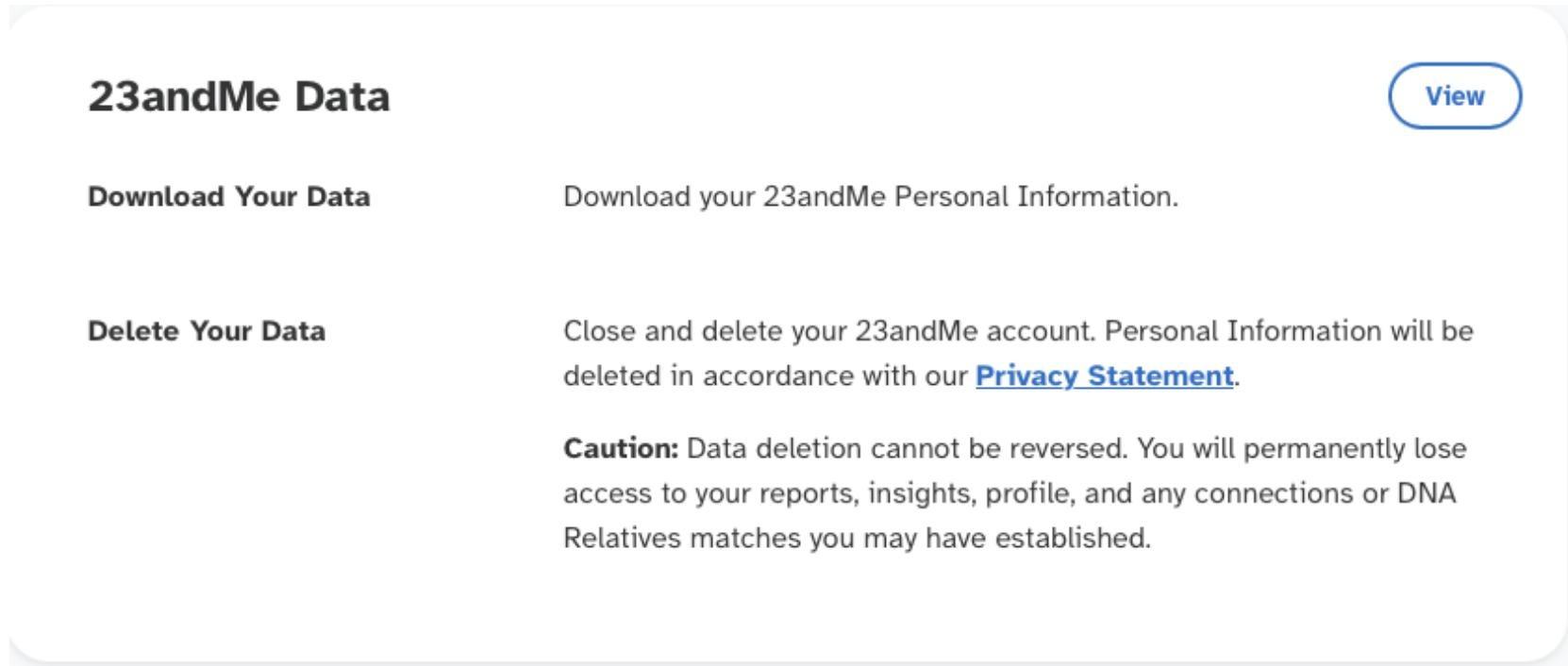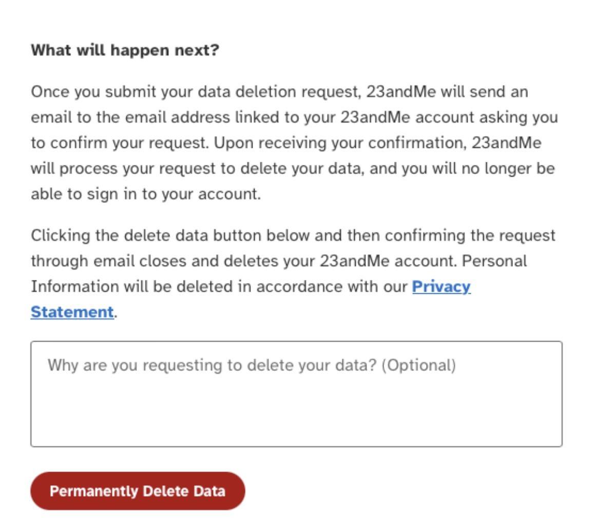 Under the Delete Data section, click Permanently Delete Data. Data deletion is irreversible, and once it is done, you will no longer be able to access the account. NOTE: The deletion will not be finalized until you confirm the request via an email sent by 23andMe