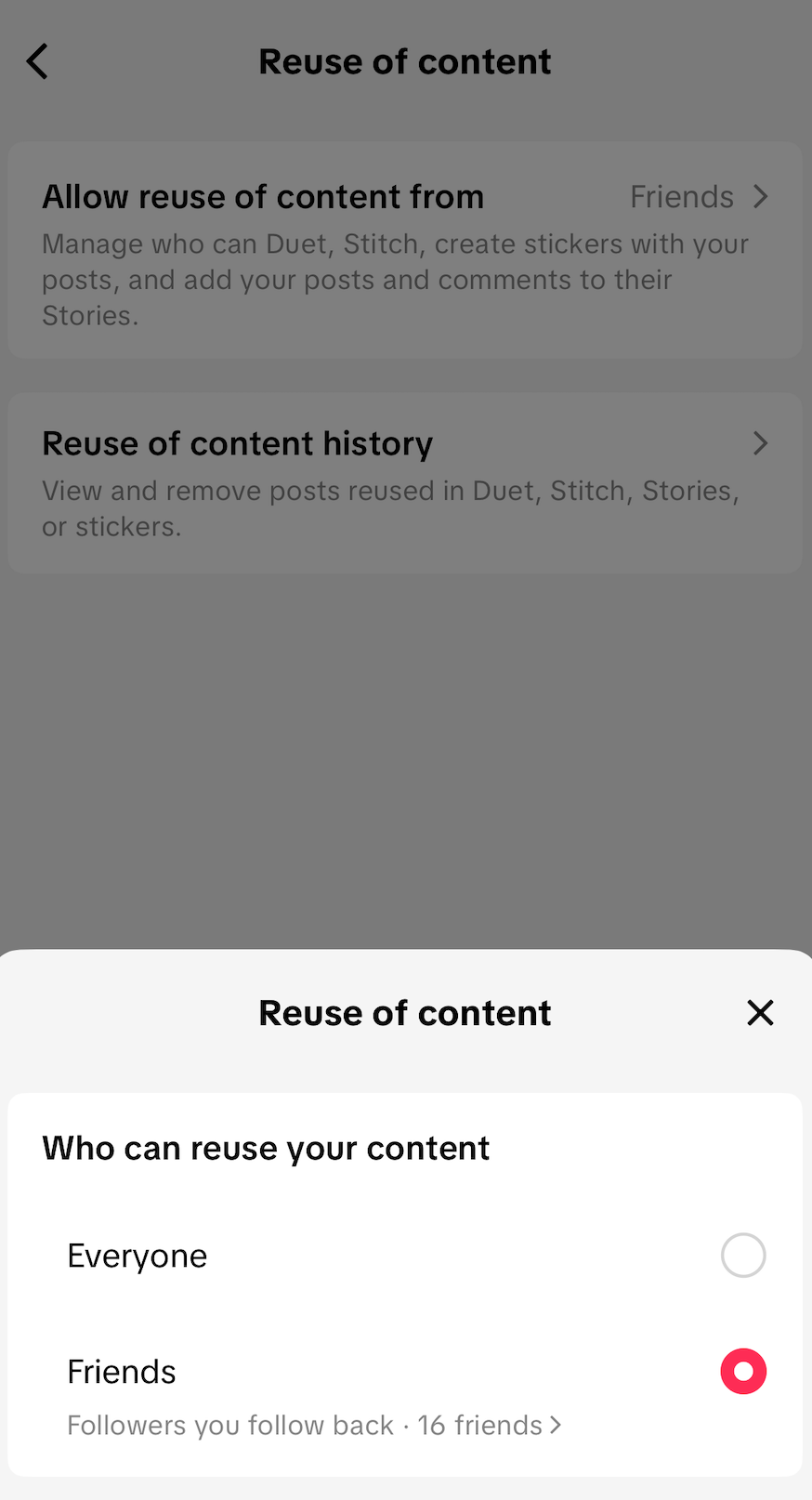 Navigate back to the main Privacy Menu and select "Reuse of Content". Change this setting to "Friends":