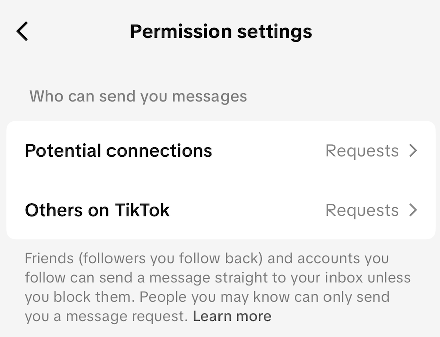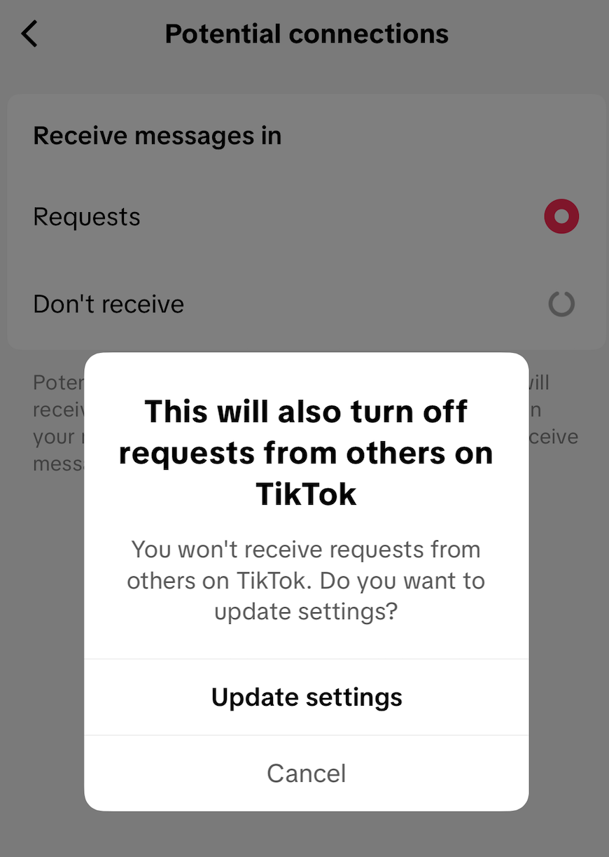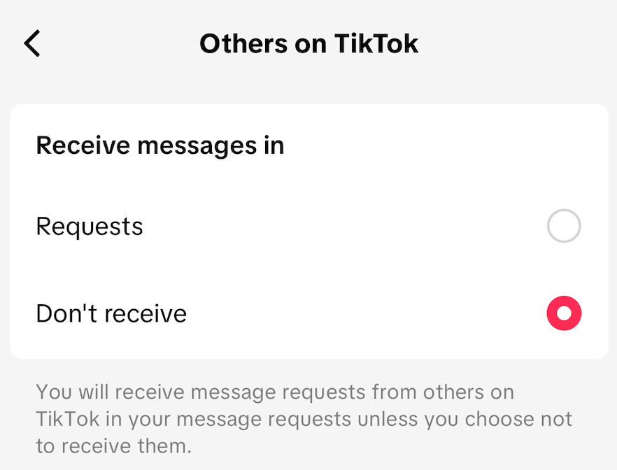 Select "Don't Receive". This will populate a second pop-up confirming you do not want to receive messages from other people on Tik-Tok who are not on your friends list. Select "Update settings":