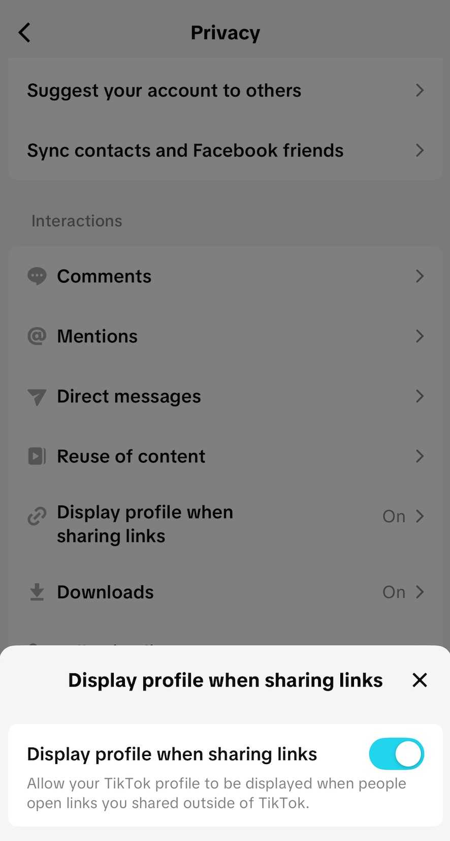 Return to the main Privacy menu. Select "Display profile when sharing links". Turn it OFF. This will change the BLUE slider into a GREY slider.