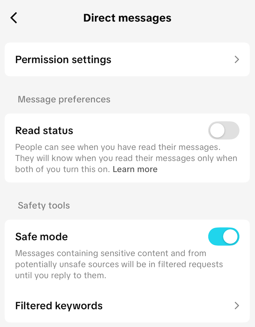 Return to the prior menu and select "Direct Messages". Turn off "Read Status", so that other people cannot identify when you've seen their messages, and enable "Safe Mode":