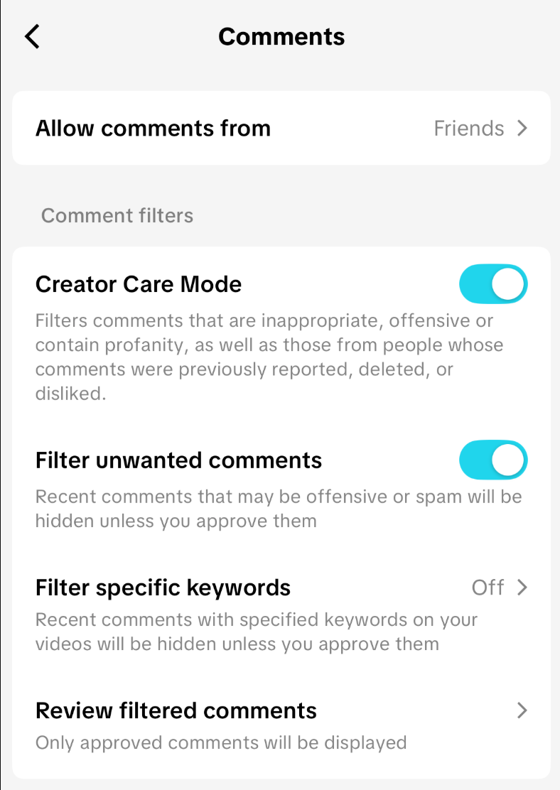 Select "Comments". Under "Comments", only allow comments from friends and enable "Filter Unwanted Comments". If you have "Creator Care Mode" available, we recommend turning on this setting as well: