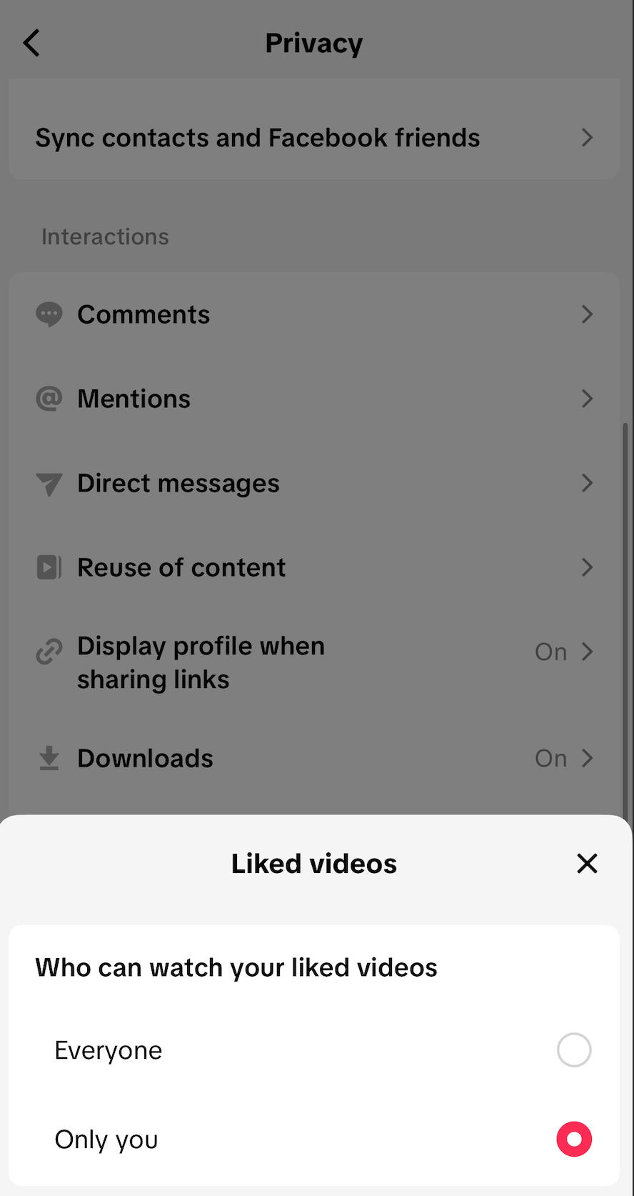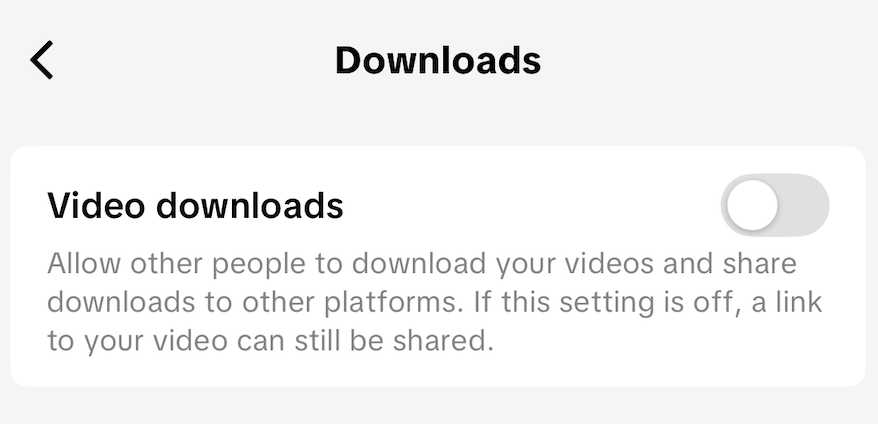 Return again to the main Privacy menu. Select "Downloads". Ensure it is set to OFF (signified by a GREY slider) to prevent other people from downloading your videos without your knowledge: