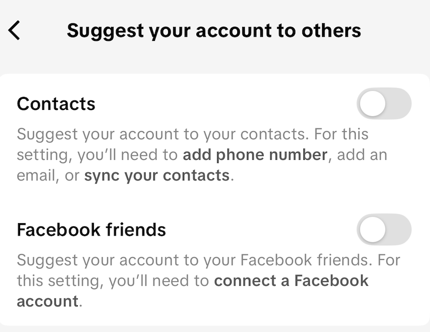 Continuing, select "Suggest your account to others". We recommend turning both options to OFF to ensure that you have maximum control over who connects to you within the platform: