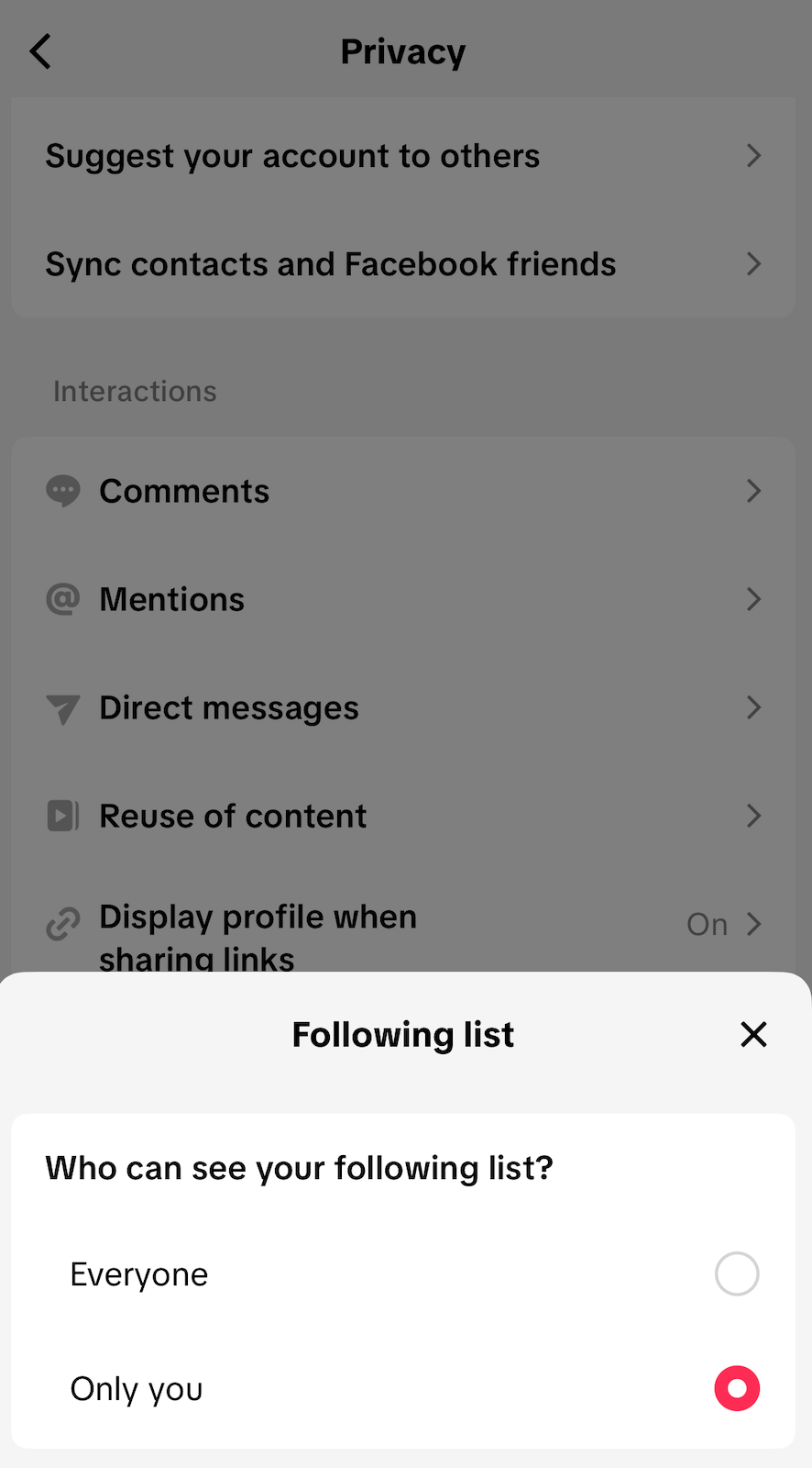 Return again to the main Privacy menu. Scroll down, and select "Following List". Select "Only you":