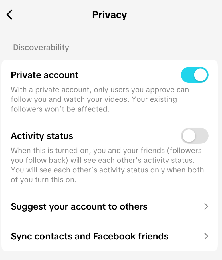 Ensure "Private Account" is set to ON (it will show Green), and Activity Status is set to OFF. These two items should appear as shown below: