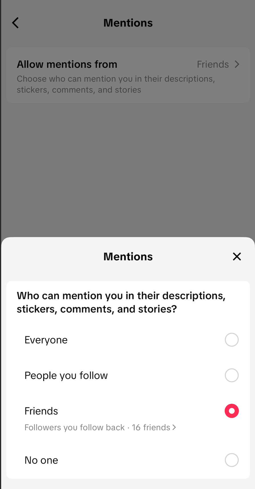 Return to the prior menu, and select "Mentions". Change this Setting from the Default of "Everyone" to "Friends":
